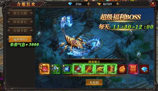 超级福利BOSS副本为:限时体验;每日上午11:30-12:00。